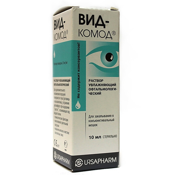 "ВИД-КОМОД раствор увлажняющий офтальмологический" представляет собой стерильный 2% водный раствор повидона, не содержащий консервантов, в оригинальном контейнере (система "КОМОД"). Водный раствор повидона раствор ВИД-КОМОД обладает необходимой вязкостью и хорошими адгезивными свойствами по отношению к передней поверхности глаза, за счет чего раствор ВИД-КОМОД образует равномерную, сохраняющуюся в течение длительного времени прероговичную слезную пленку, которая длительно не смывается при моргании и не вызывает снижение остроты зрения. Тем самым глаз защищен от ощущения сухости и раздражения, которые часто возникают при контакте с окружающей средой, а также при ношении контактных линз. Применение раствора ВИД-КОМОД делает ношение жестких или мягких контактных линз более комфортным, при этом раствор ВИД-КОМОД не откладывается на поверхности линз.